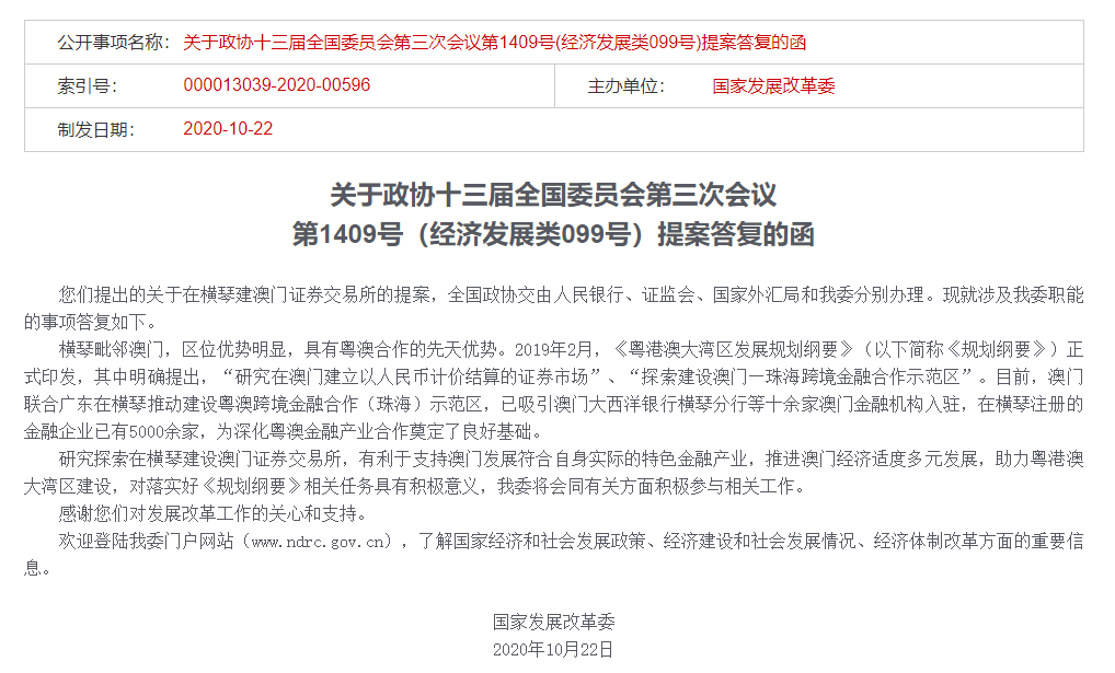 答復(fù)明確表示,研究探索在橫琴建設(shè)澳門證券交易所。“我委將會(huì)同有關(guān)方面積極參與相關(guān)工作。”