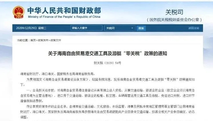 12月29日,財(cái)政部、海關(guān)總署、稅務(wù)總局公布了《關(guān)于海南自由貿(mào)易港交通工具及游艇“零關(guān)稅”政策的通知》(下稱《通知》),在海南全島封關(guān)運(yùn)作前,對海南自由貿(mào)易港注冊登記并具有獨(dú)立法人資格,從事交通運(yùn)輸、旅游業(yè)的企業(yè),進(jìn)口用于交通運(yùn)輸、旅游業(yè)的船舶、航空器、車輛等營運(yùn)用交通工具及游艇,免征進(jìn)口關(guān)稅、進(jìn)口環(huán)節(jié)增值稅和消費(fèi)稅。