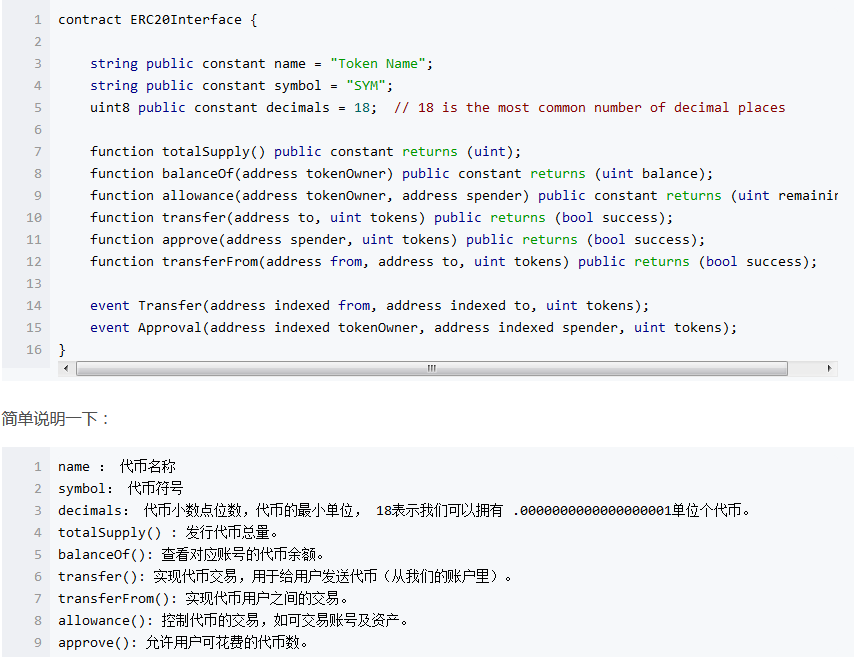 這邊還要介紹下ERC20,ERC20是以太坊定義的一個代幣標準。該標準要求我們在實現(xiàn)代幣的時候必須要遵守的協(xié)議,只有支持了協(xié)議才能被以太坊錢包支持。下面是協(xié)議代碼接口,看不懂沒關(guān)系,找個程序員都能搞定。