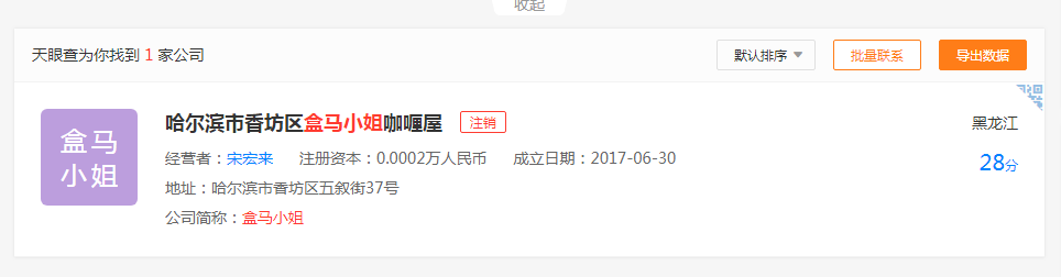 我們通過天眼查發(fā)現(xiàn),“盒馬夫人”、“盒馬爸爸”都是湖南每日三果貿(mào)易有限公司注冊,“盒馬兄弟”商標(biāo)持有人是香港品牌集眾管理有限公司,“盒馬小姐”持有者是哈爾濱市香坊區(qū)盒馬小姐咖喱屋,目前該公司顯示已注銷。
